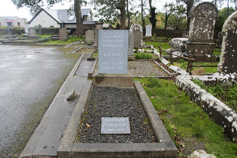 Una semplice, liscia lapide che riporta una frase scelta da Yeats stesso “Cast a cold eye on life, on death, horseman pass by!”. Yeats morì in Francia nel 1939 e solo nel 1948 fu trasportato a Drumcliff, ai piedi del Ben Bulben, l’amata montagna. Effettivamente dal cimitero si vede benissimo la sagoma particolare e schiacciata del Ben Bulben che quel giorno era circondata da diverse nuvole molto basse e cariche d’acqua.