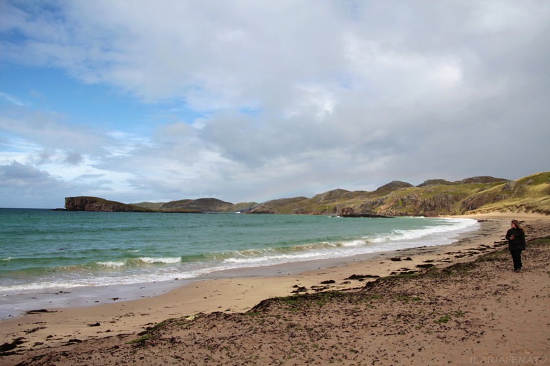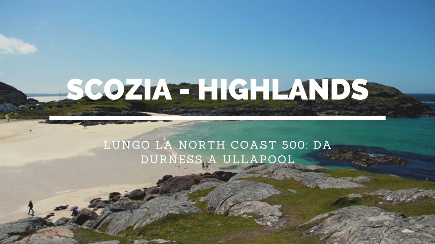 Siamo sulla panoramica North Coast 500, nelle Highlands scozzesi. La strada è tortuosa ma scenografica toccando spiagge, promontori e fiordi. Si snoda tra paesaggi incantevoli e spazi infiniti a perdita d’occhio. Ci lasciamo alle spalle Durness, per raggiungere altri punti d’interesse, sempre nella regione del Sutherland, dal tratto che va da Durness a Ullapool.