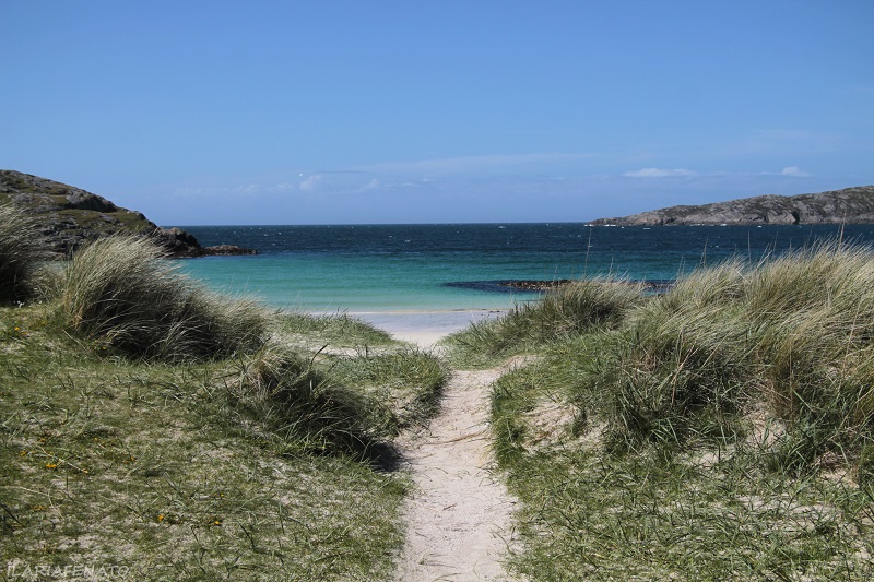 Ci lasciamo le montagne alla spalle per tornare verso la costa e scoprire la baia di Achmelvich. Una volta attraversata una strada single track e un piccolo sentiero si inzia a scorgere l’azzurro fortissimo ed il rumore delle onde che si infrangono sulla spiaggia bianchissima; attirano come una calamita. Io ho avuto la fortuna di osservarla illuminata dai raggi del sole e non sembrava più di essere in Scozia, bensì ai Caraibi. E’ abbracciata da formazioni rocciose che si possono scalare facilmente per avere una vista più ampia su tutta la baia e farsi sferzare il viso dal vento forte. Anche qui abbiamo un piccolo insediamento di case, un parcheggio per camper e poco altro ma non credo ci sia bisogno di molto altro!
