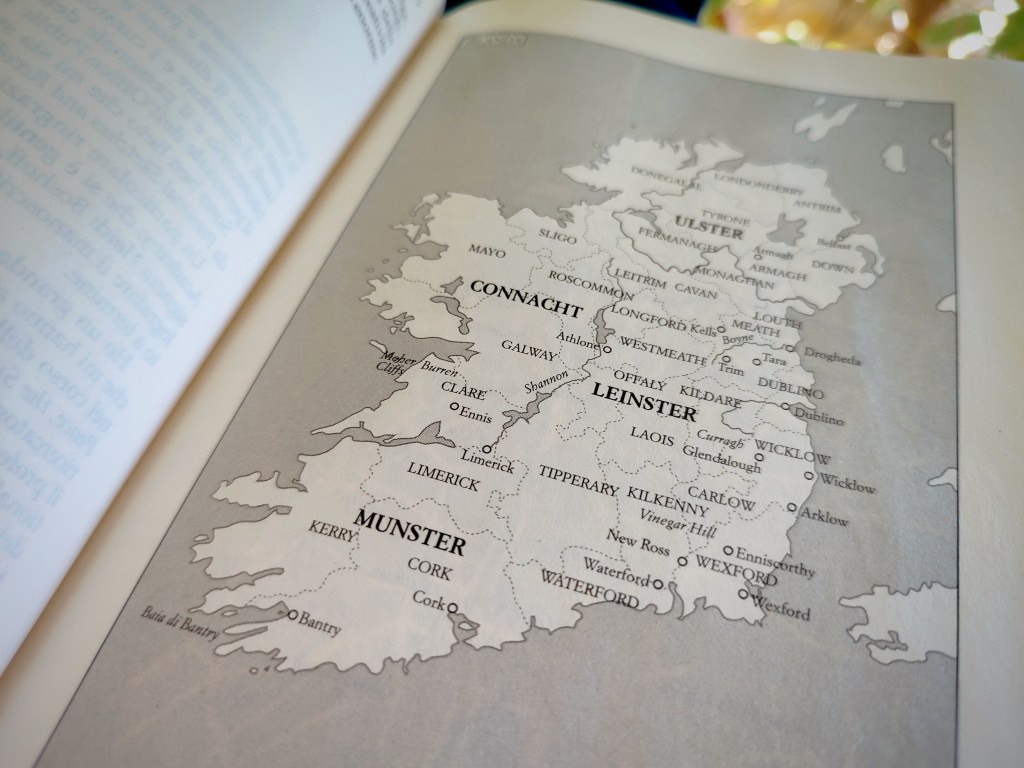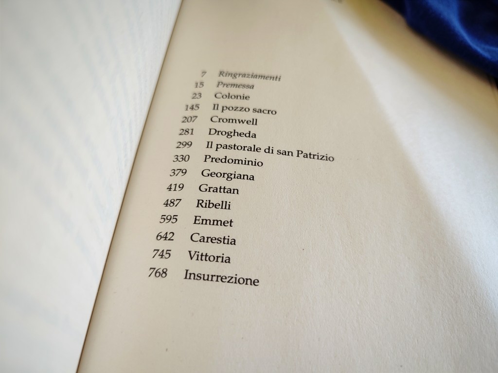 Il libro si apre con il periodo in cui L’Irlanda diventa una meta per i migranti provenienti dall’Inghilterra, con lo scopo di appropriarsi di terreni e proprietà. Fu proprio Maria Tudor a dare il via a quel flusso migratorio. Sebbene gli irlandesi fossero cattolici la regina non si fidava di loro e perciò scelse due zone in cui piccole comunità di inglesi furono invitate ad insediarsi. Il racconto prosegue poi con l’arrivo di Cromwell e le questioni tra i re d’Inghilterra, soprattutto Carlo I che fu decapitato, e tutta la questione tra i puritani protestanti e cattolici.