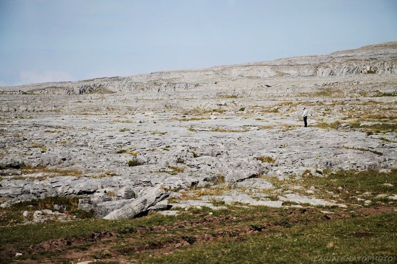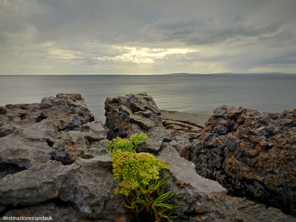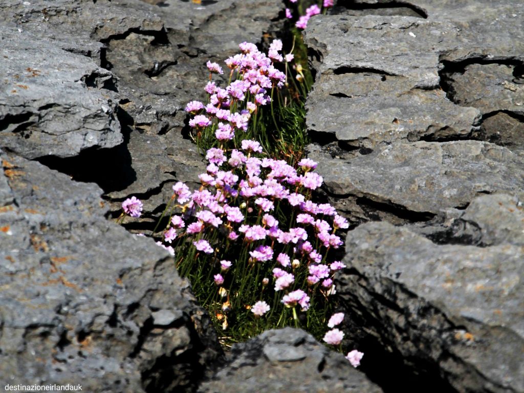 La regione del Burren è un luogo di colline e distese di grigia arenaria in cui si trovano antiche tombe, chiese e fortificazioni. Il Burren si estende per circa 250 chilometri quadrati, il suo nome significa “distretto pietroso” proprio perché la regione emerge dalla costa con insenature scavate dal mare che 350 milioni di anni fa lo ricopriva interamente. Ecco perché sembra completamente priva di vegetazione, ma esplorando a piedi ci si accorge che la vegetazione ha trovato modo di vivere e creare un habit particolare e magico nei canali stretti detti “grykes”. La flora è ricca di specie di orchidee, gerani, erica, rose selvatiche, genziane, felci ecc…che normalmente non crescerebbero nello stesso ambiente. Questo grazie alla combinazione delle piogge, i venti salmastri, la corrente del golfo che non fa scendere mai troppo la temperatura, i fiumi sotterranei che tengono umida la torba.